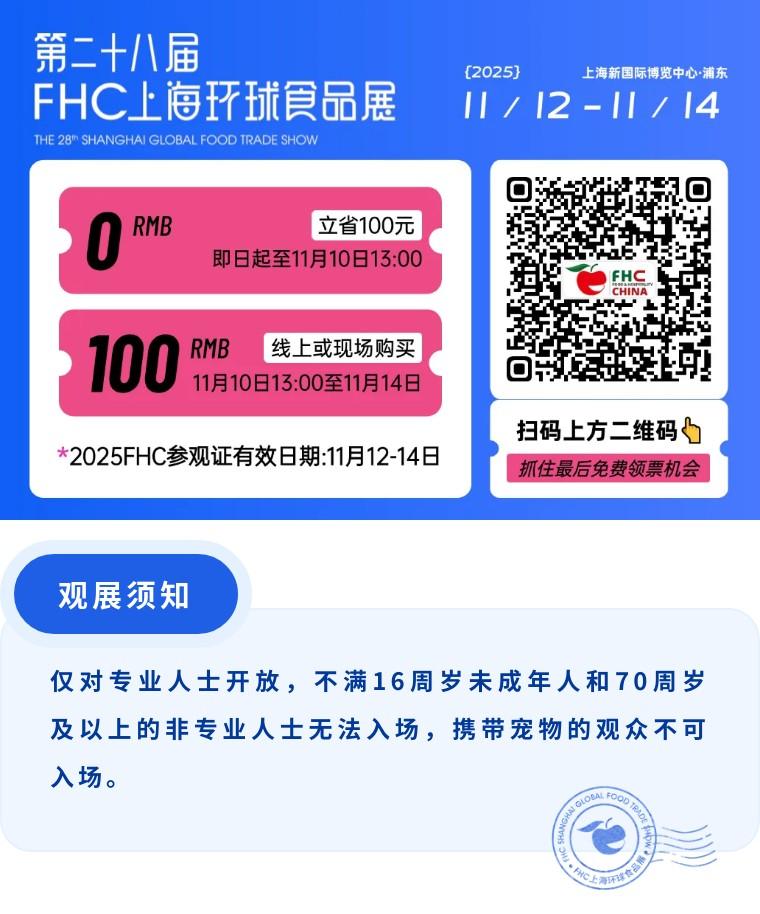 距离2025FHC上海环球食品展开展已不足30天,专业观众免费领票通道将于11月10日中午13:00正式关闭,现场购买参观证需支付100元!