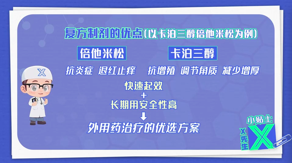 从药物成分来看,不同成分的外用药作用机制不同,适用情况也有差异。比如,复方制剂(如卡泊三醇倍他米松)是临床常用的外用药,其中卡泊三醇能调节皮肤细胞的增殖与分化,减少皮损形成;倍他米松则具有强大的抗炎、止痒作用,两者结合不仅起效快,能迅速控制炎症、减轻瘙痒,还因副作用拮抗(即抵消),提高了安全性,实现1+1>2的效果。