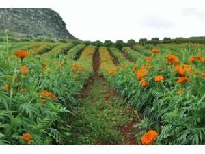 万寿菊为菊科万寿菊属植物,它的提取物中含有叶黄素,是天然植物色素,是饲料、食品、饮料中的添加剂,深度提取物又是一种高效药物,国际市场价格昂贵。万寿菊种植加工项目采取“公司+基地+农户”的产业化经营模式,项目实施至少可带动蒙自市5万至10万亩万寿菊种植生产,每年可实现经济收入2亿元,具有较好的经济效益和社会效益。 至2012年6月,万寿菊种植面积达到7000亩,预计亩产鲜花2000-2500公斤,每公斤0.85元,亩产可达1700-2125元,是种玉米收益的三倍。