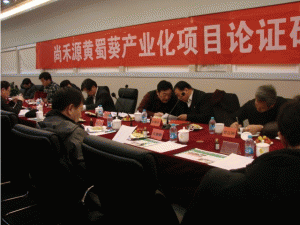 2014年1月15日,尚禾源黄蜀葵产业项目论证研讨会在北京长缨酒店会议室召开,会议由中国食品工业协会花卉食品专业委员会王有德主持,中纪委驻农业部纪检组原组长、国务院稽查特派员、高级工程师宋树有、中国食品工业协会原秘书长黄圣明、中国中医协会首席专家张金生、北京果树研究院原副所长、教授级高工刘忠章、北京养生文化创意产业协会会长赵立东、河北农业科学院副院长王海波及唐山尚禾源农业开发有限公司董事长石国刚等20余位专家参加了本次研讨会。